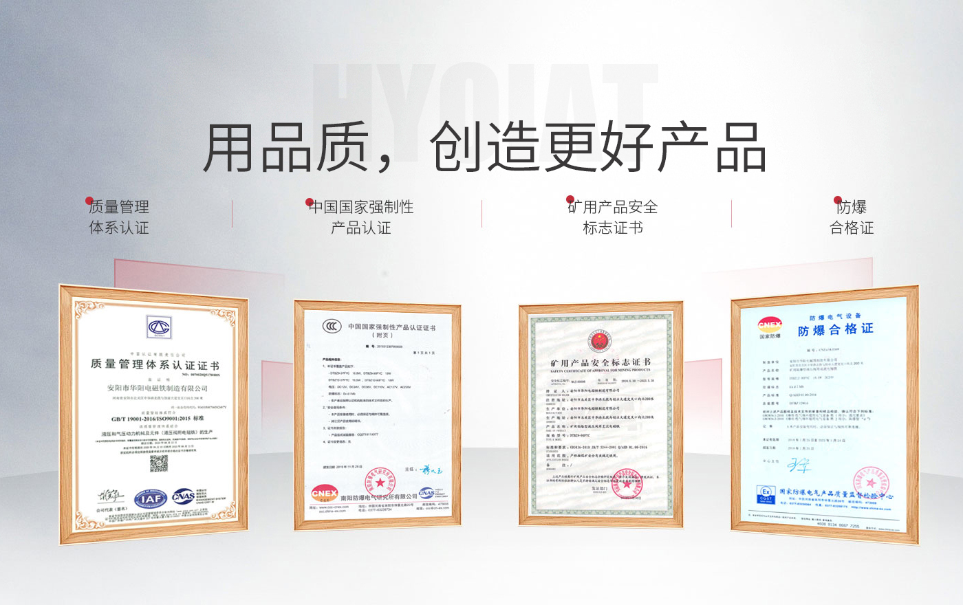 公司已通過ISO質量、環境、職業健康管理三體系認證,IATF16949: 2016質量管理體系認證,CE認證,Ⅰ類、Ⅱ類和Ⅲ類防爆產品認證等,擁有多項科技果及數十項專利,并建有“河南省液壓閥用電磁鐵工程技術研究中心”、“河南省企業技術中心”。
